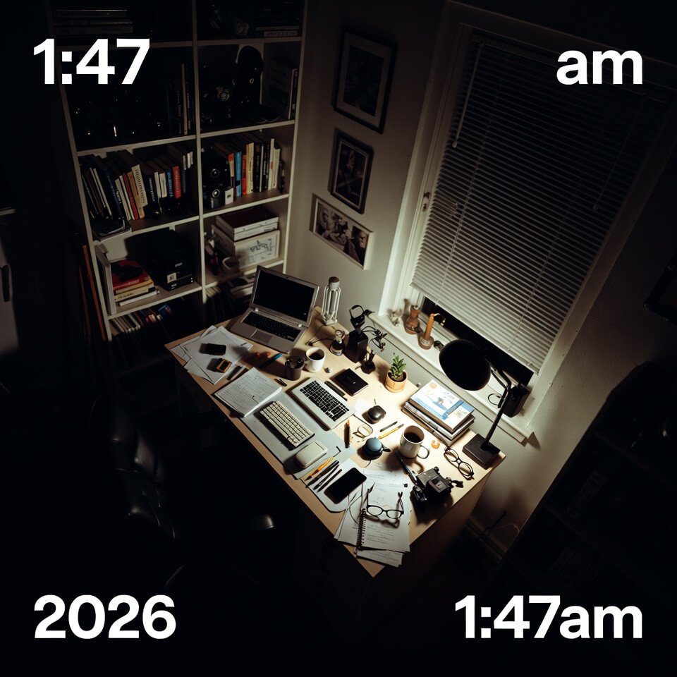 Real self-taught designer desk chaos at 1:47am